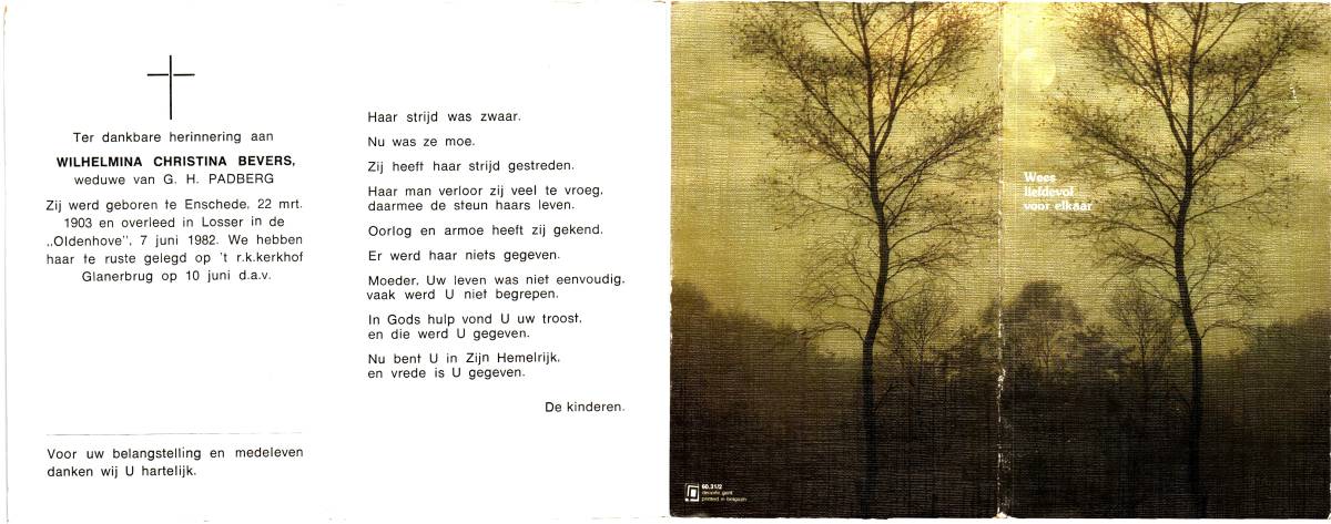 BEVERS, Wilhelmina Christina, geboren op 22-3-1903 te Enschede, overleden op 7-6-1982 te Losser op 79-jarige leeftijd, begraven op 10-6-1982 te Glanerbrug.