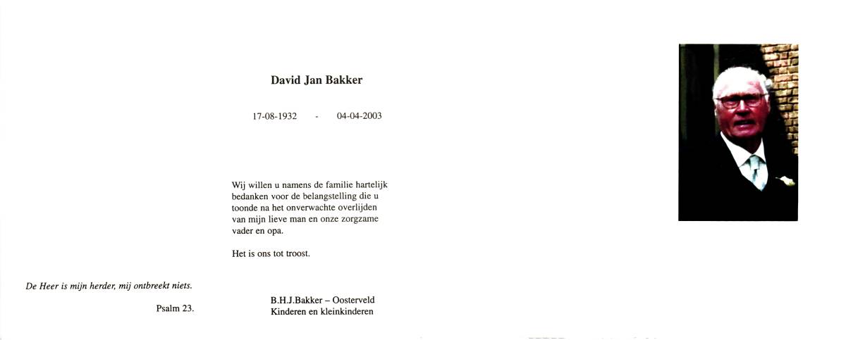 BAKKER, David Jan, geboren op 17-8-1932, overleden op 4-4-2003 op 70-jarige leeftijd.