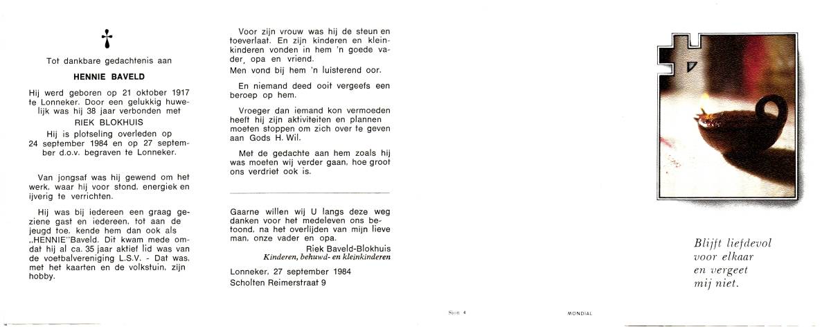 BAVELD, Hennie, geboren op 21-10-1917 te Lonneker, overleden op 24-9-1984 te Lonneker op 66-jarige leeftijd, begraven op 27-9-1984 te Lonneker.