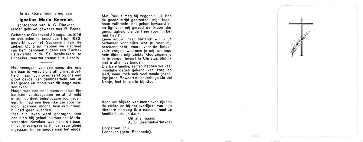 BEERNINK, Ignatius Maria, geboren op 30-8-1905 te Oldenzaal, overleden op 1-7-1982 te Enschede op 76-jarige leeftijd, gecremeerd op 5-7-1982 te Usselo.