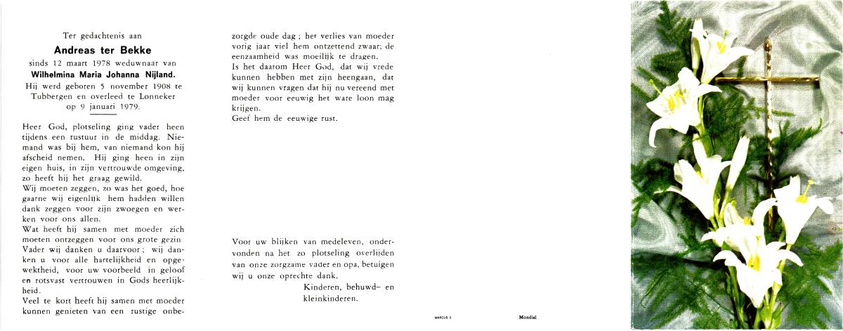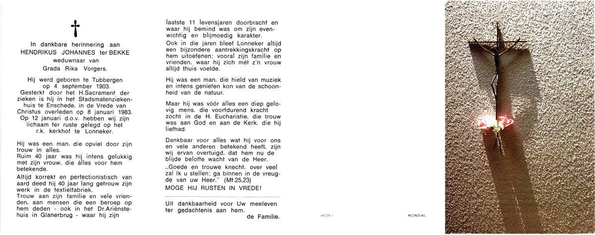 BEKKE, ter, Hendrikus Johannes, geboren op 4-9-1903 te Tubbergen, overleden op 8-1-1983 te Enschede, ziekenhuis op 79-jarige leeftijd, begraven op 12-1-1983 te Lonneker.