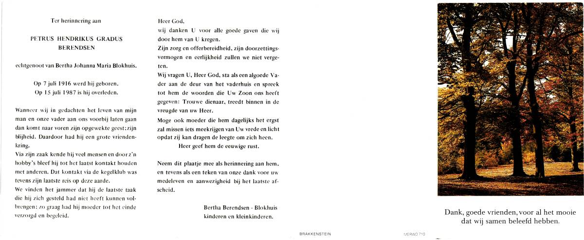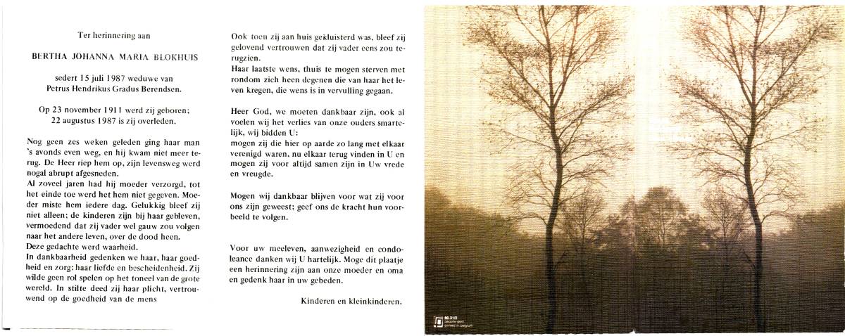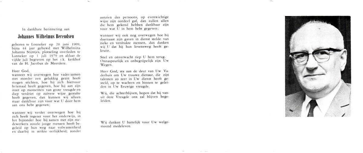 BERENDSEN, Johannes Wilhlemus, geboren op 20-6-1909 te Lonneker, overleden op 1-7-1979 te Lonneker op 70-jarige leeftijd, begraven op 5-7-1979 te Lonneker.