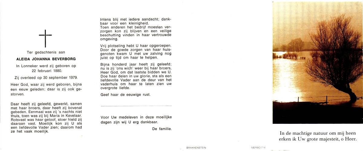 BEVERBORG, Aleida Johanna, geboren op 22-02-1880 te Lonneker, overleden op 30-9-1979 te Lonneker op 99-jarige leeftijd.
