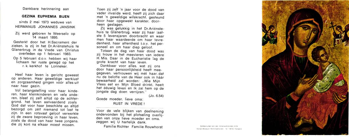 BIJEN, Gezina Euphemia, geboren op 14-03-1895 te Weerselo, overleden op 1-2-1983 te Glanerbrug op 87-jarige leeftijd, begraven op 5-2-1983 te Lonneker.
