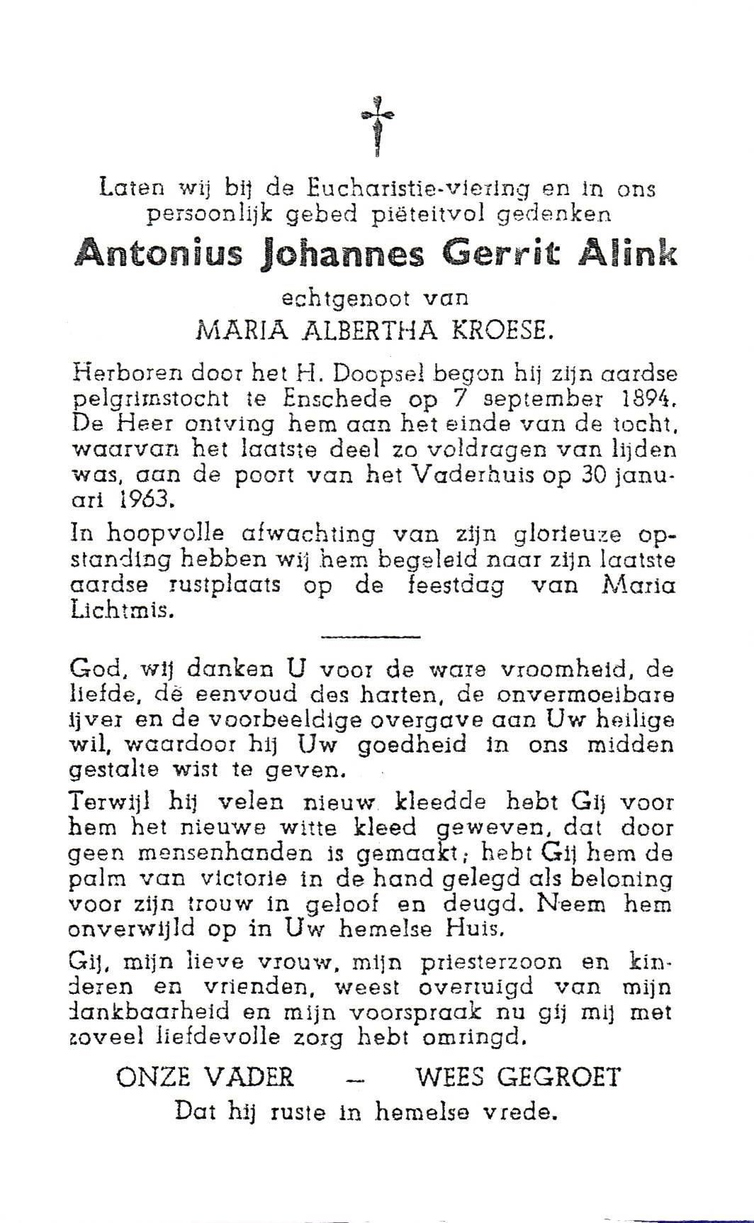 ALINK, Hendrikus Franciscus, geboren op 19-12-1901 te Enschede, overleden op 13-2-1991 te Oldenzaal op 89-jarige leeftijd, gecremeerd op 18-2-1991 te Usselo.