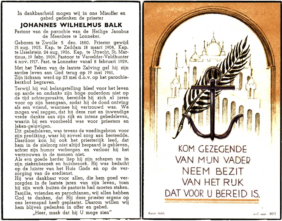 BALK, Johannes Wilhelmus, geboren op 05-12-1880 te Zwolle, overleden op 19-5-1961 te Lonneker op 80-jarige leeftijd, begraven op 23-5-1961 te Lonneker.
