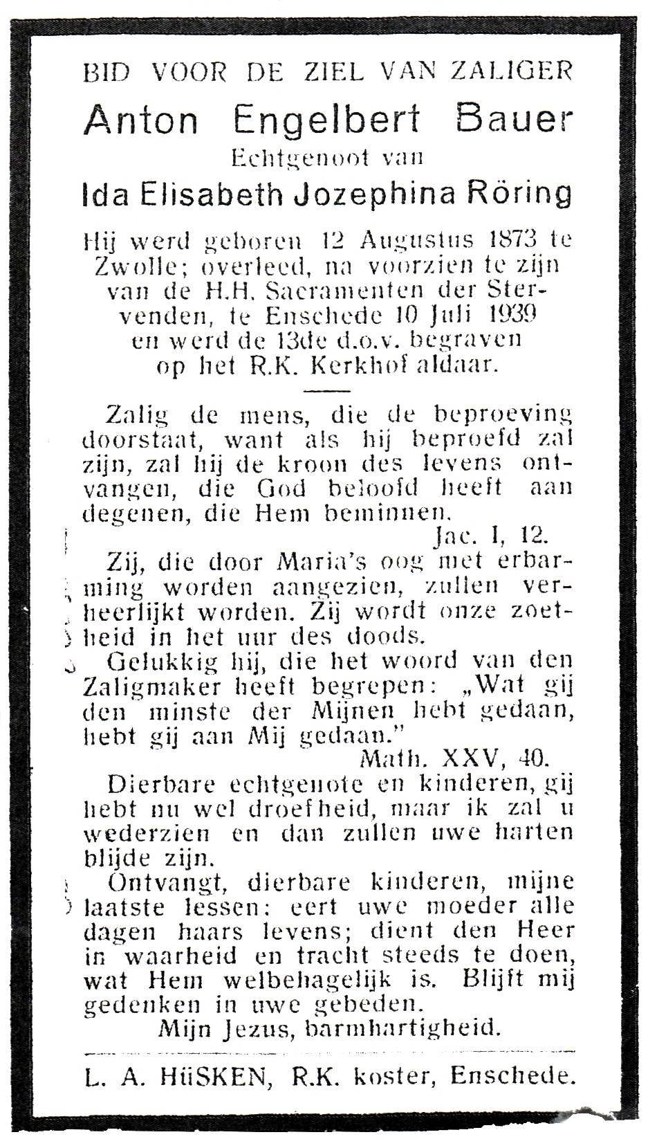 AVESKAMP , Hendrikus Lambertus, geboren op 08-12-1884 te Denekamp, overleden op 6-3-1935 te Hilversum op 50-jarige leeftijd, begraven op 9-3-1935 te Hilversum.