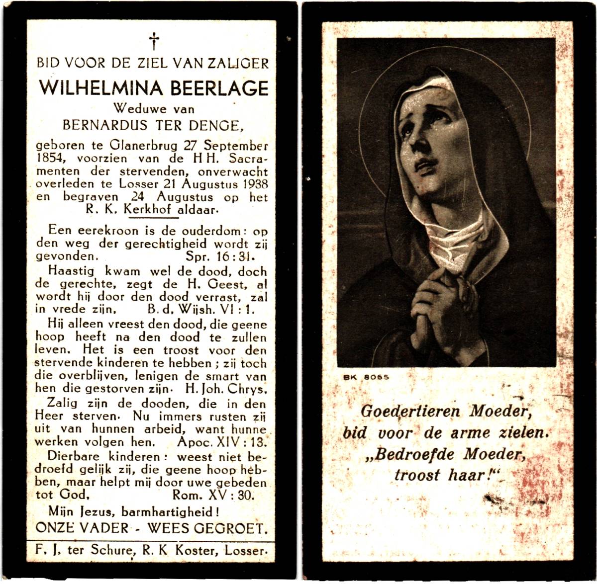 BEERLAGE, Wilhelmina, geboren op 27-09-1854 te Glanerbrug, overleden op 21-8-1938 te Losser op 83-jarige leeftijd, begraven op 24-8-1938 te Losser.