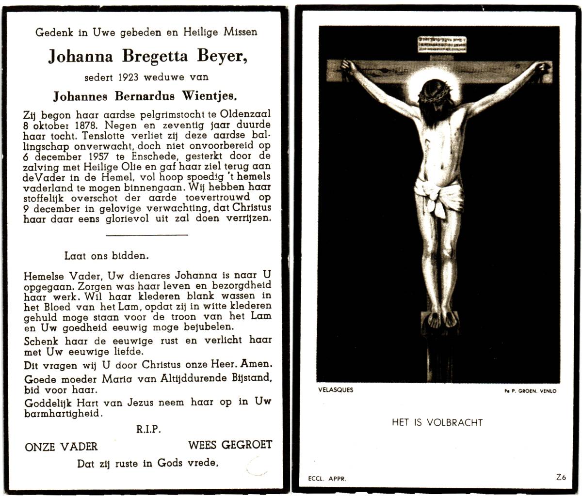 BEYER, Johanna Bregetta, geboren op 08-10-1878 te Oldenzaal, overleden op 6-12-1957 te Enschede op 79-jarige leeftijd, begraven op 9-12-1957.