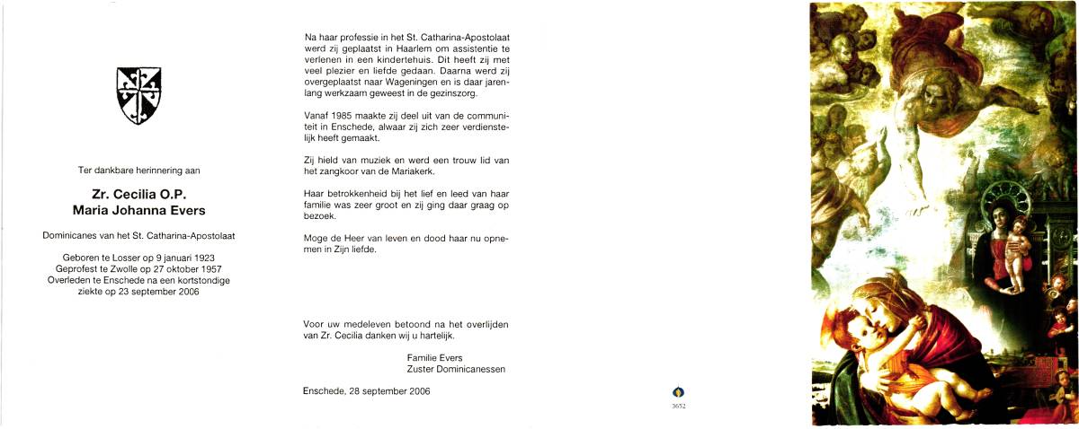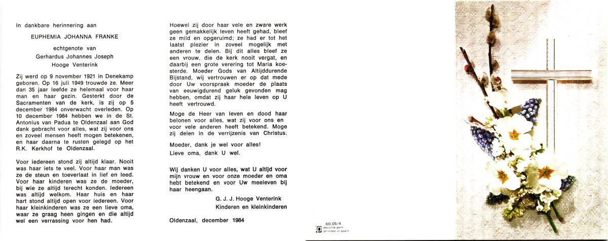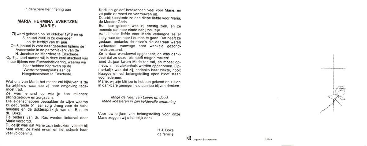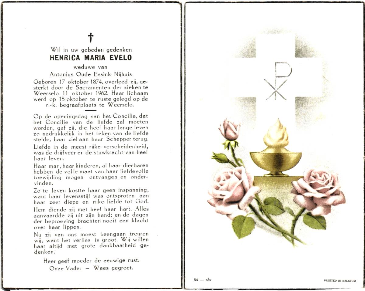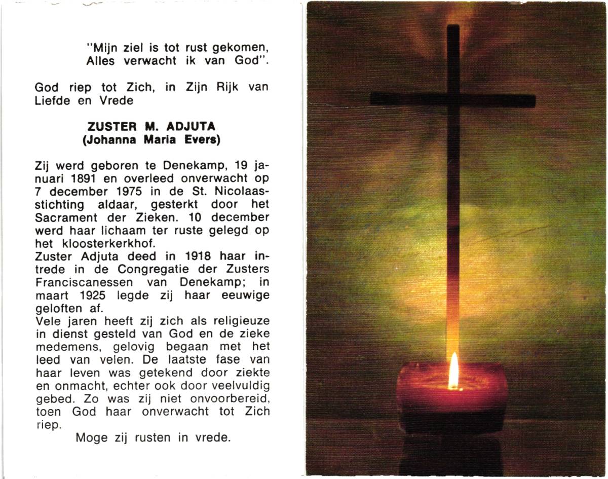 EVERS, Johanna Maria, geboren op 19-01-1891 te Denekamp, overleden op 7-12-1975 te Denekamp op 84-jarige leeftijd, begraven op 10-12-1975 te Denekamp.