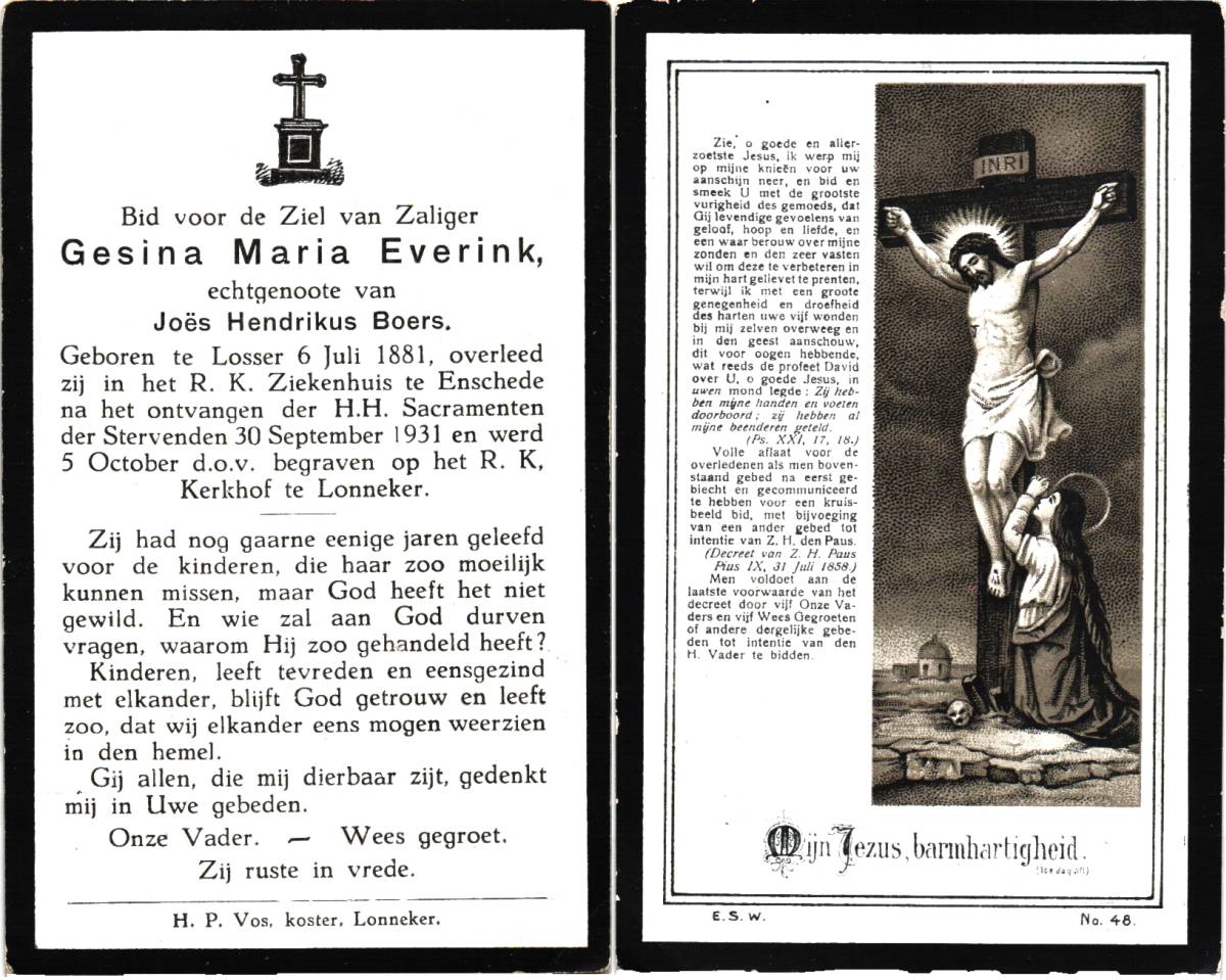 EVERINK, Gesina Maria, geboren op 06-07-1881 te Losser, overleden op 30-9-1931 te Enschede, ziekenhuis op 50-jarige leeftijd, begraven op 5-10-1931 te Lonneker.
