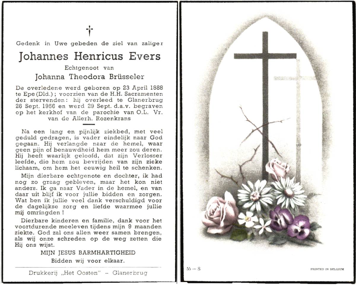 EVERS, Johannes Henricus, geboren op 23-04-1888 te Epe, Dld, overleden op 28-9-1956 te Glanerbrug op 68-jarige leeftijd, begraven op 29-9-1956 te Glanerbrug.
