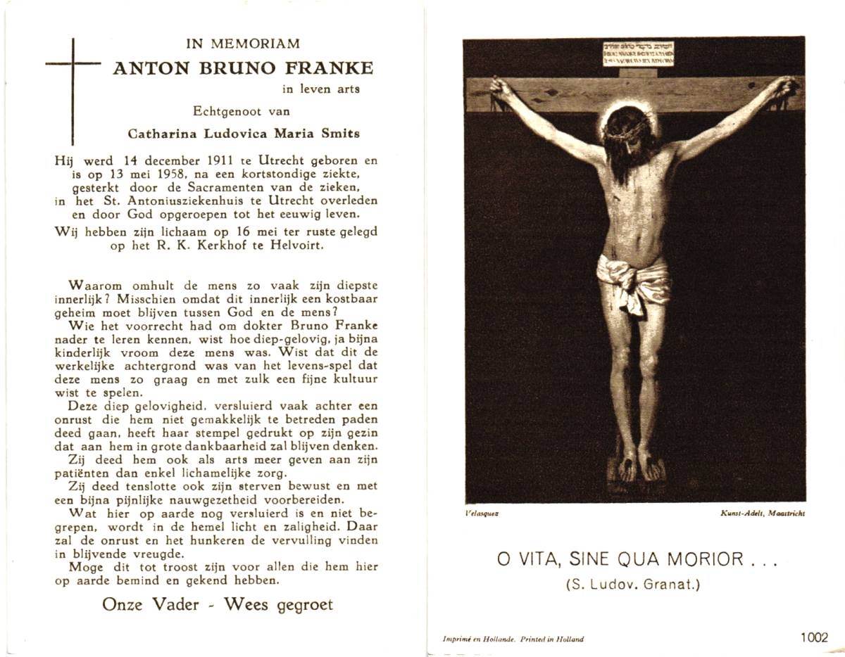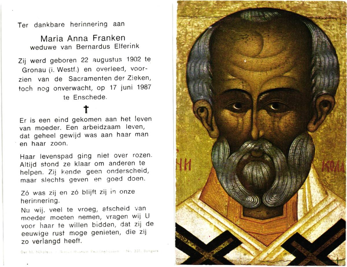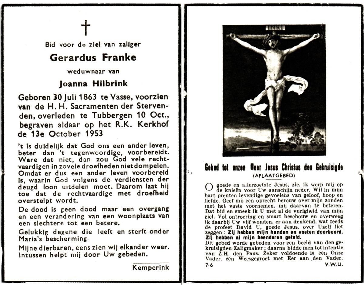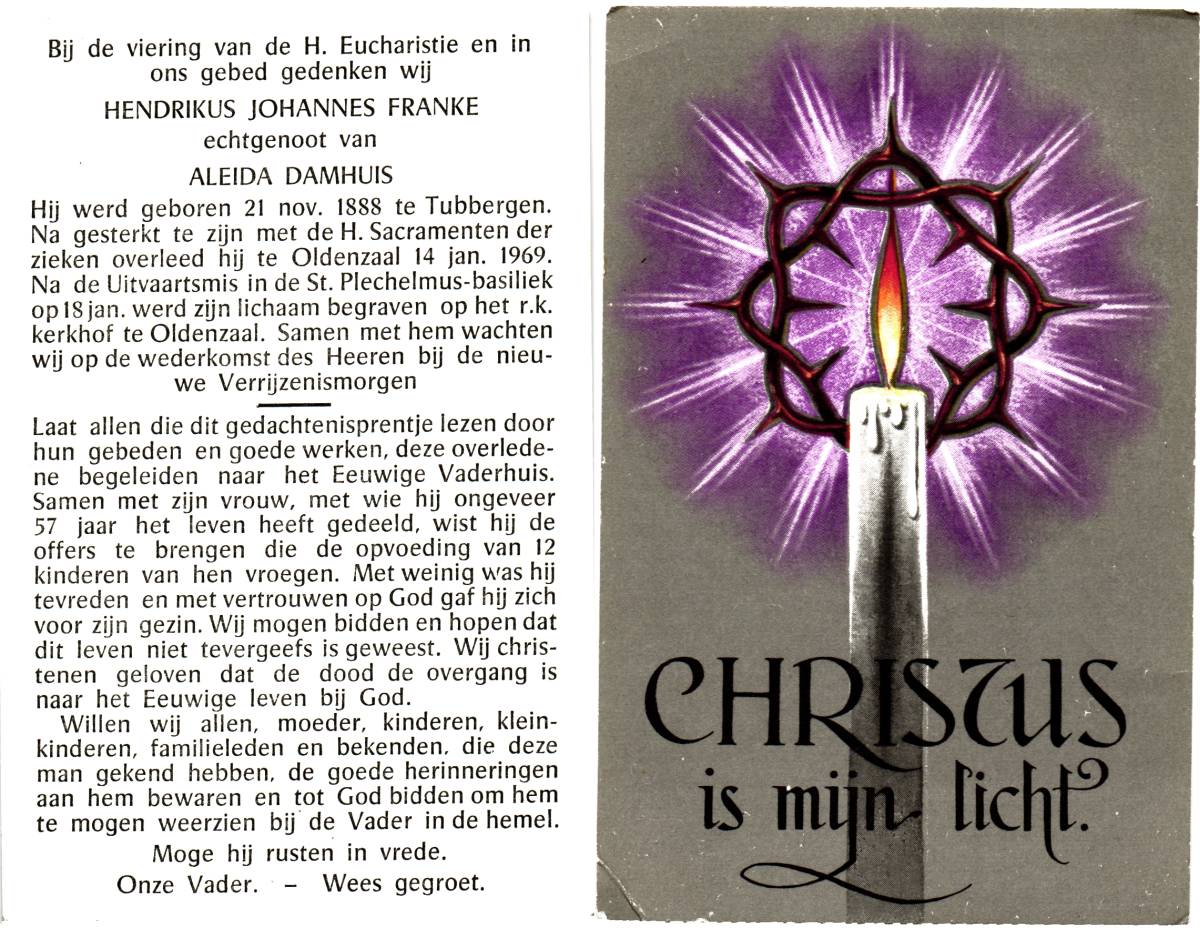 FRANKE, Hendrikus Johannes, geboren op 21-11-1888 te Tubbergen, overleden op 14-1-1969 te Oldenzaal op 80-jarige leeftijd, begraven op 18-1-1969 te Oldenzaal.