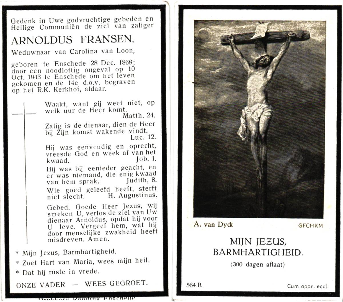 FRANSEN, Arnoldus, geboren op 28-12-1868 te Enschede, overleden op 10-10-1943 te Enschede op 74-jarige leeftijd, begraven op 14-10-1943 te Enschede.