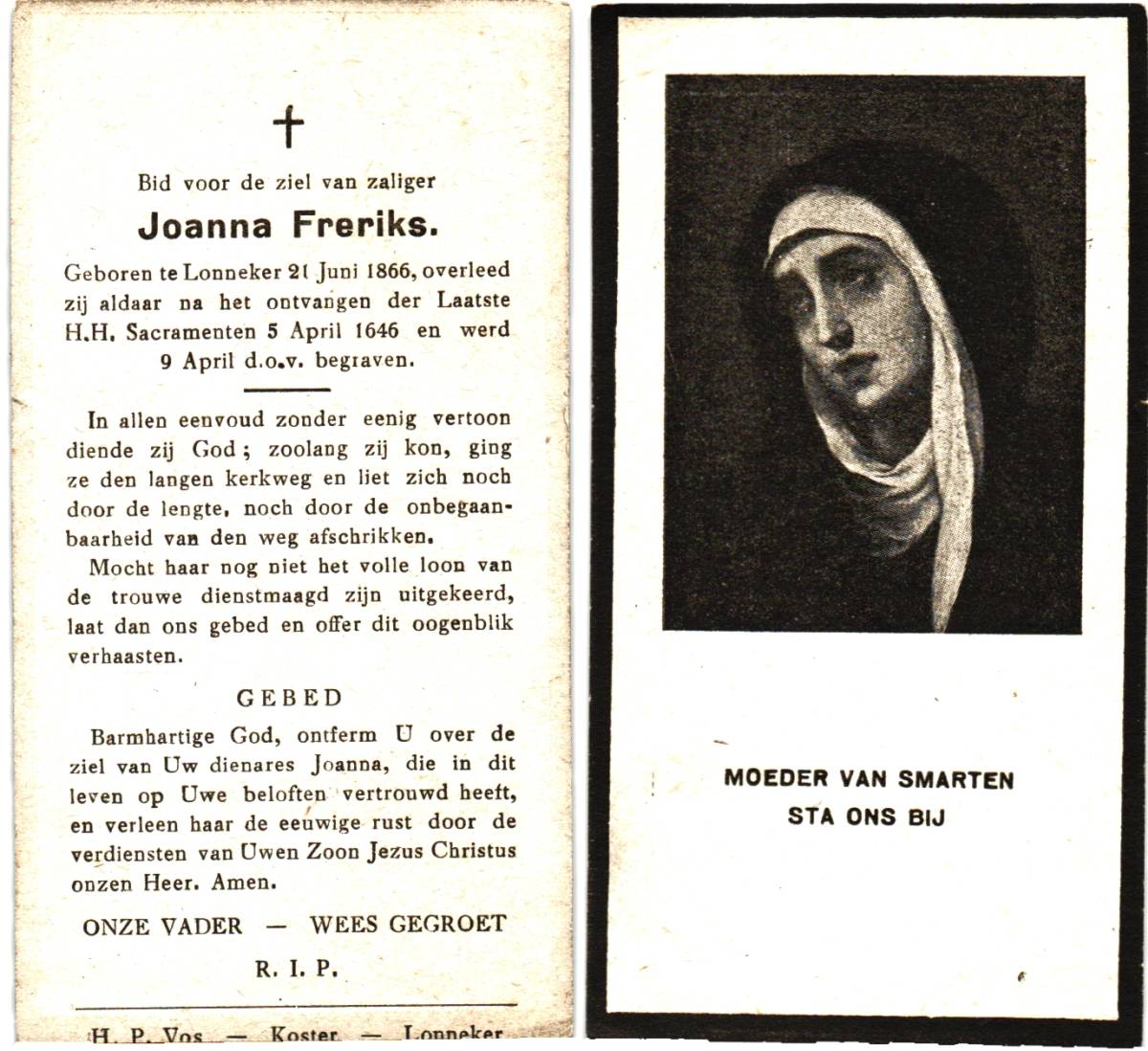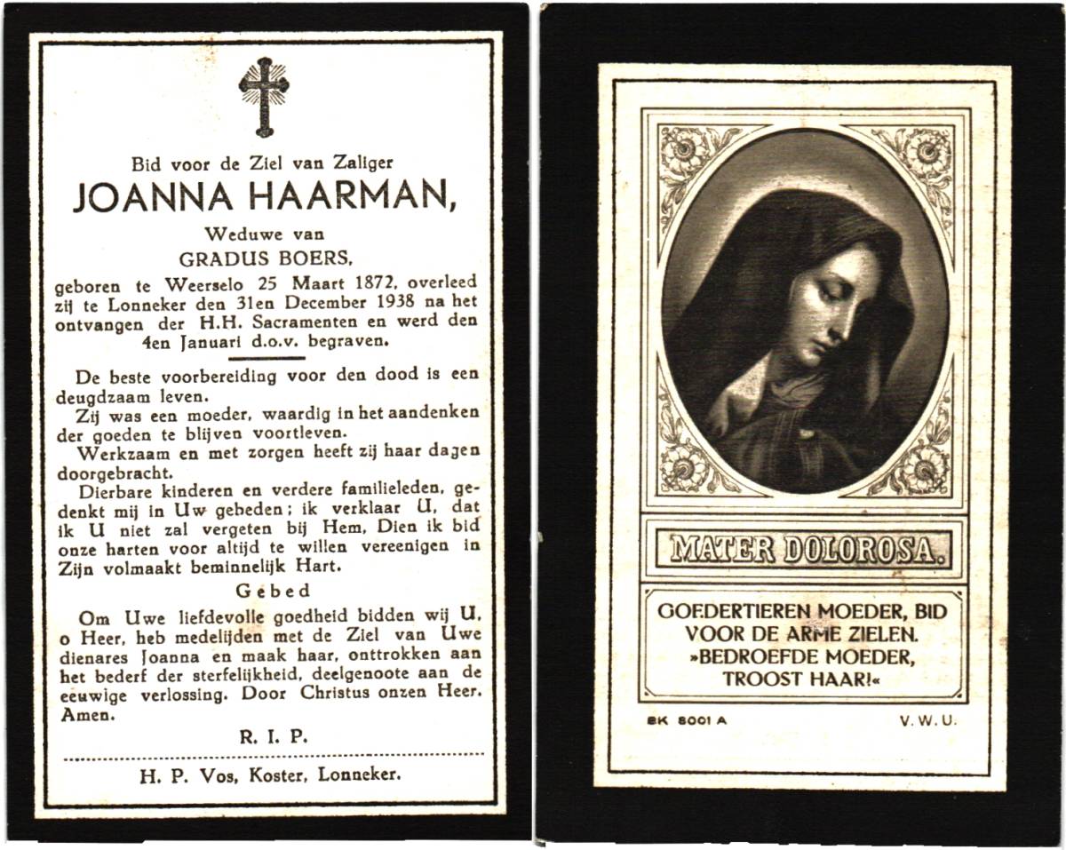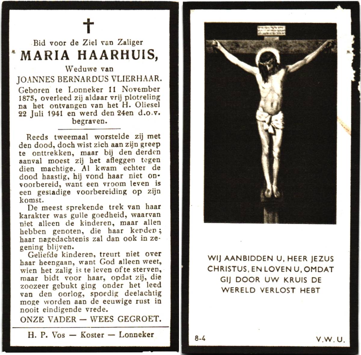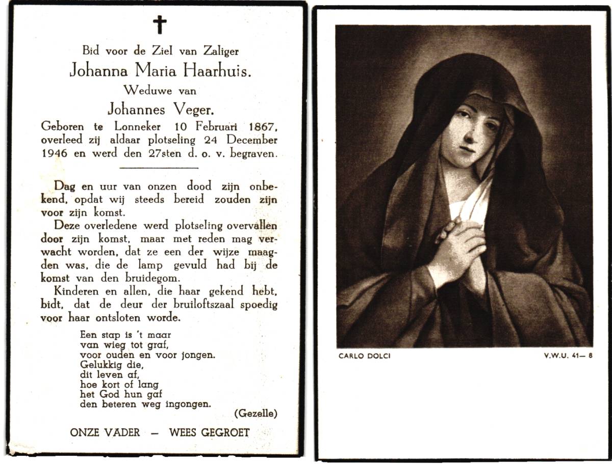 HAARHUIS, Johanna Maria, geboren op 10-02-1867 te Lonneker, overleden op 24-12-1946 te Lonneker op 79-jarige leeftijd, begraven op 27-12-1946 te Lonneker.