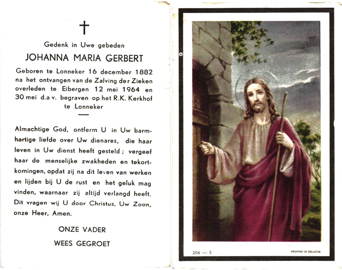 GERBERT, Johanna Maria, geboren op 16-12-1882 te Lonneker, overleden op 12-5-1964 te Eibergen op 81-jarige leeftijd, begraven op 30-5-1964 te Eibergen.