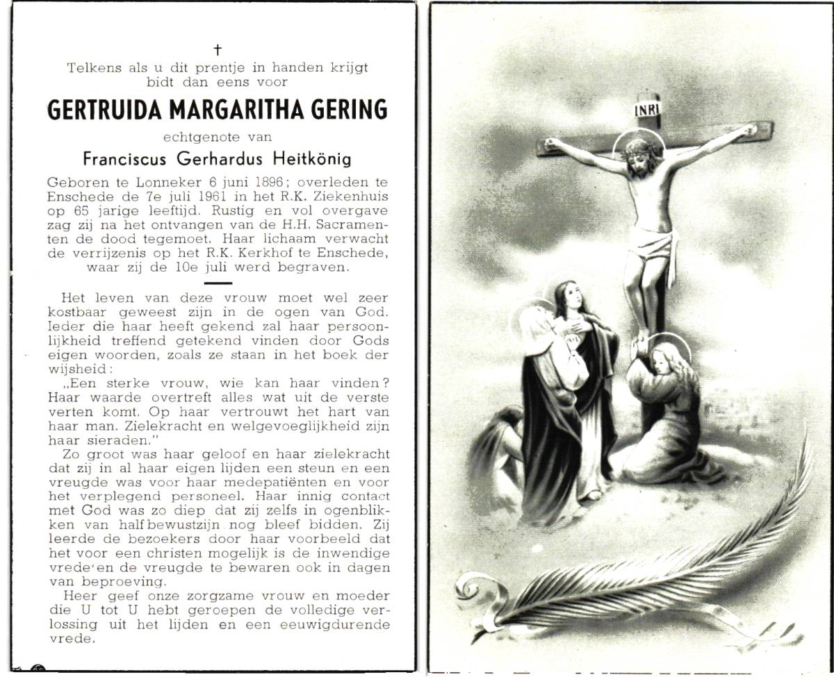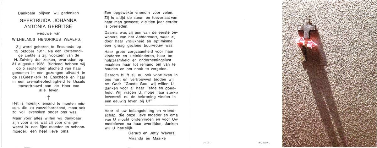 GERRITSE, Geertruida Johanna Antonia, geboren op 15-10-1911 te Enschede, overleden op 31-8-1988 op 76-jarige leeftijd, gecremeerd op 5-9-1988 te Usselo (Gem. Enschede).