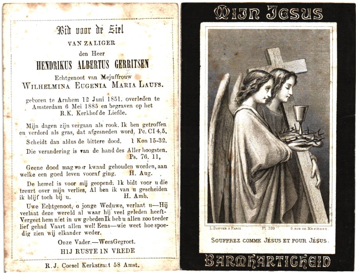 GERRITSEN, Hendrikus Albertus, geboren op 12-06-1851 te Arnhem, overleden op 06-05-1885 te Amsterdam op 33-jarige leeftijd.