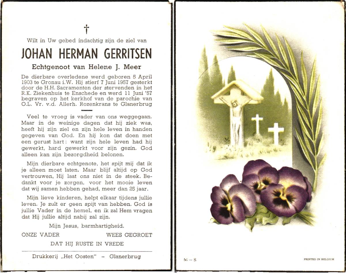 GERRITSEN, Johan Herman, geboren op 5-4-1903 te Gronau, Dld, overleden op 7-6-1957 te Enschede, ziekenhuis op 54-jarige leeftijd, begraven op 11-6-1957 te Glanerbrug.