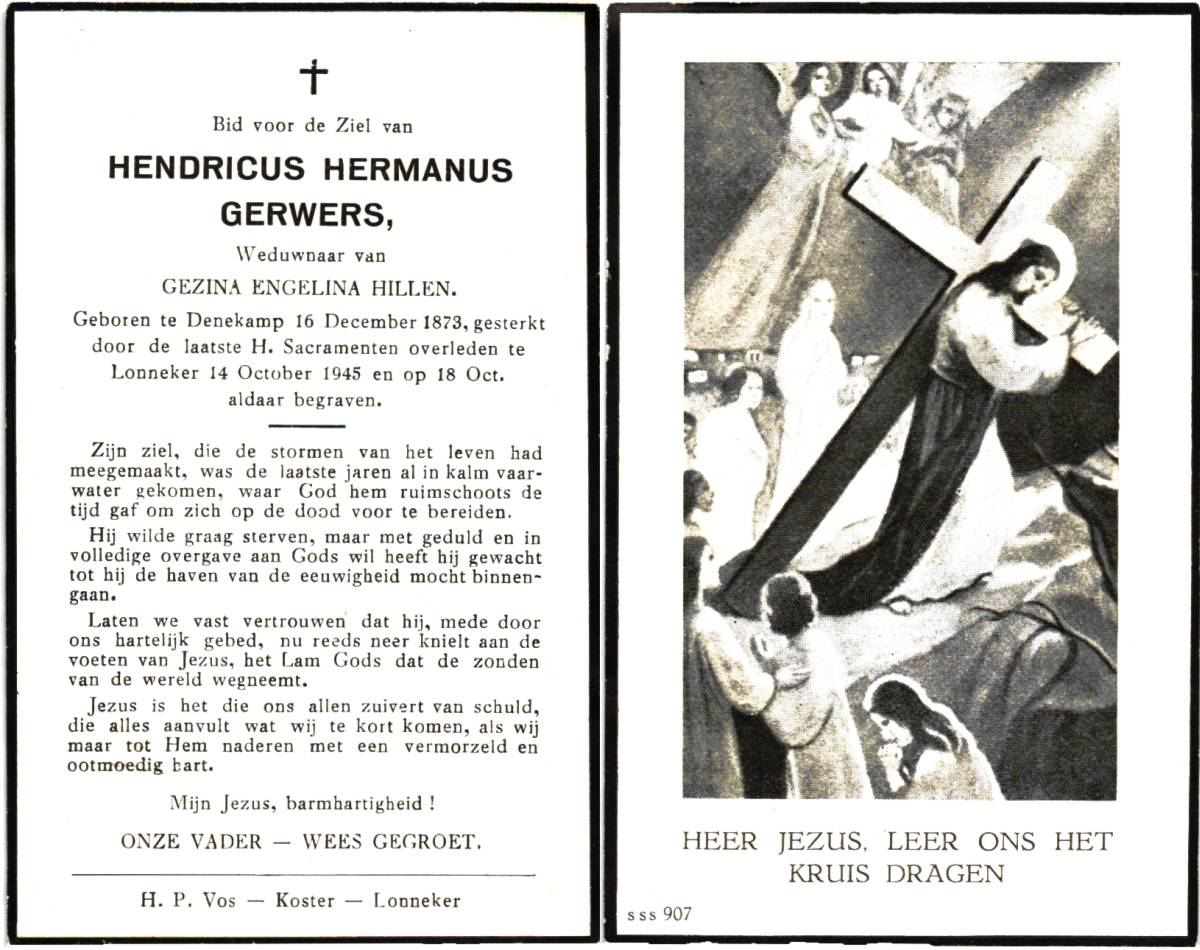 GERWERS, Hendricus Hermanus, geboren op 16-12-1873 te Denekamp, overleden op 14-10-1945 te Lonneker op 71-jarige leeftijd, begraven op 18-10-1945 te Lonneker.