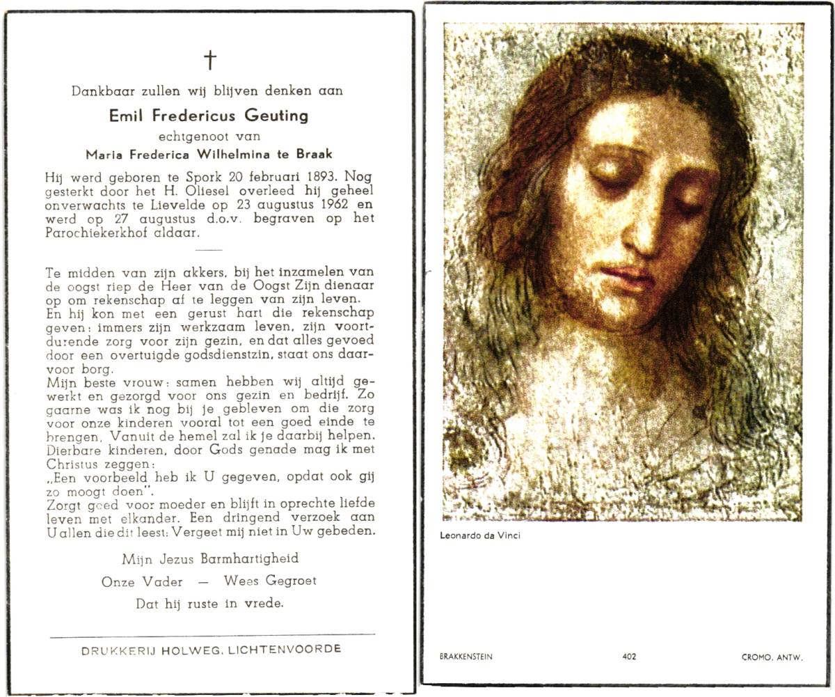 GEUTING, Emil Fredericus, geboren op 20-02-1893 te Spork, overleden op 23-8-1962 te Lievelde op 69-jarige leeftijd, begraven op 27-8-1962 te Lievelde.
