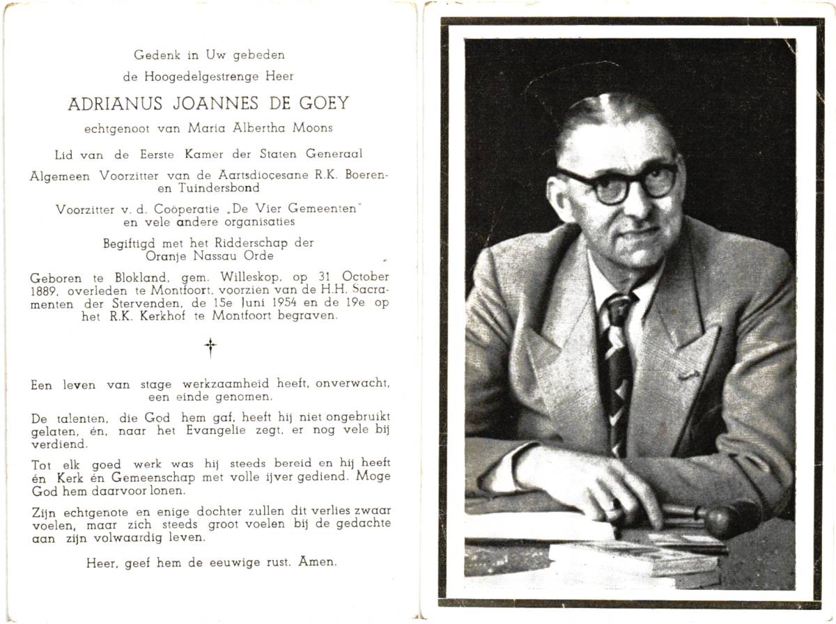 GOEY, de, Adrianus Joannes, geboren op 31-10-1889 te Willeskop, Blokland, overleden op 15-6-1954 te Montfoort op 64-jarige leeftijd, begraven op 19-6-1954 te Montfoort.