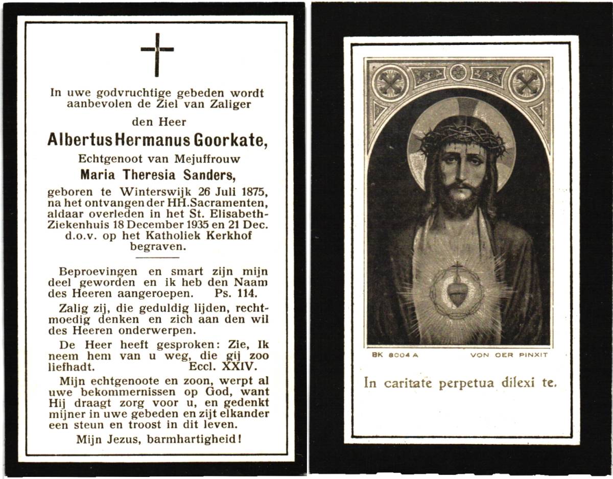GOORKATE, Albertus Hermanus, geboren op 26-07-1875 te Winterswijk, overleden op 18-12-1935 te Winterswijk op 60-jarige leeftijd, begraven op 21-12-1935 te Winterswijk.