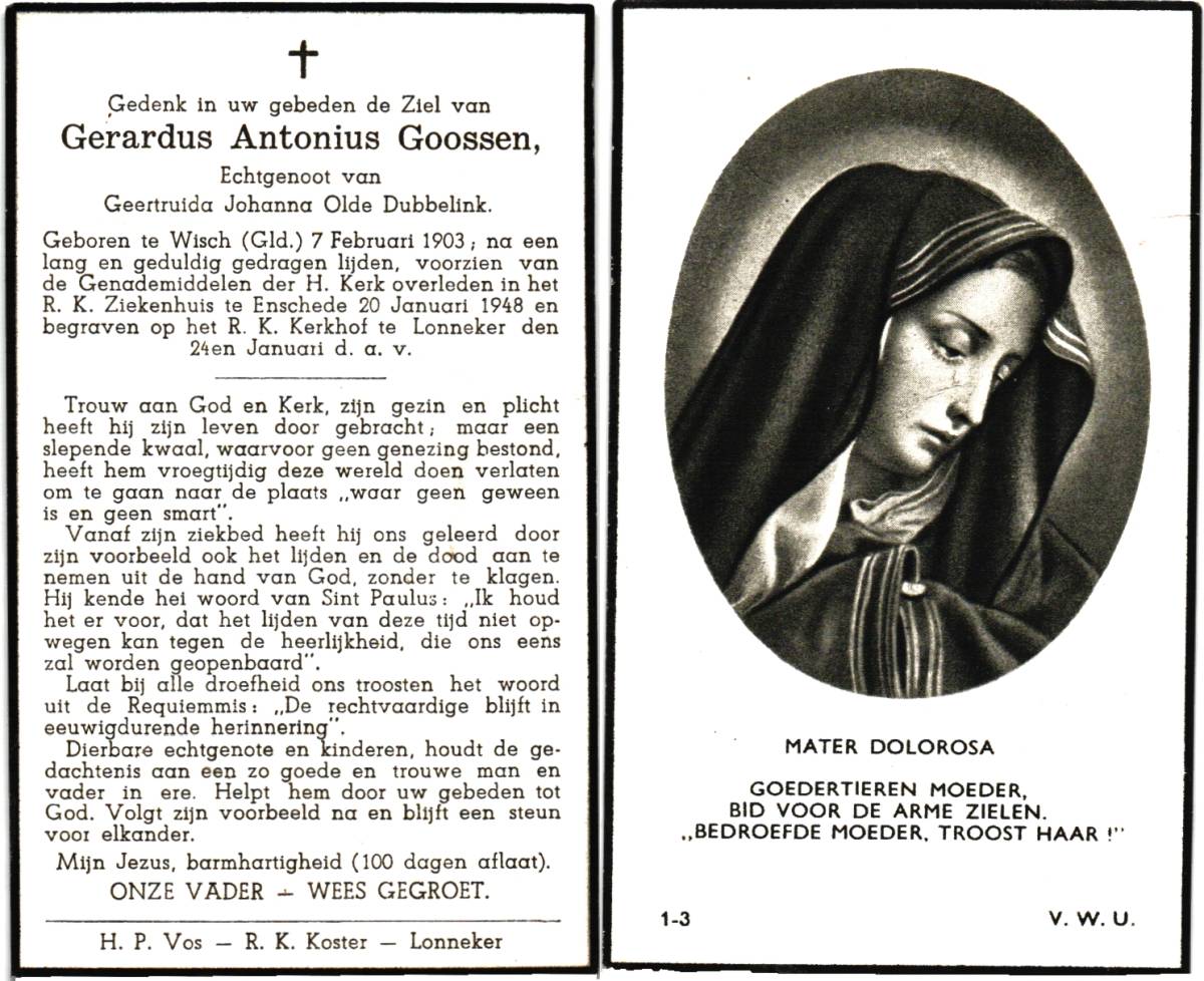 GOOSSEN, Gerardus Antonius, geboren op 7-2-1903 te Wisch, Gld, overleden op 20-1-1948 te Enschede, ziekenhuis op 44-jarige leeftijd, begraven op 24-1-1948 te Lonneker.