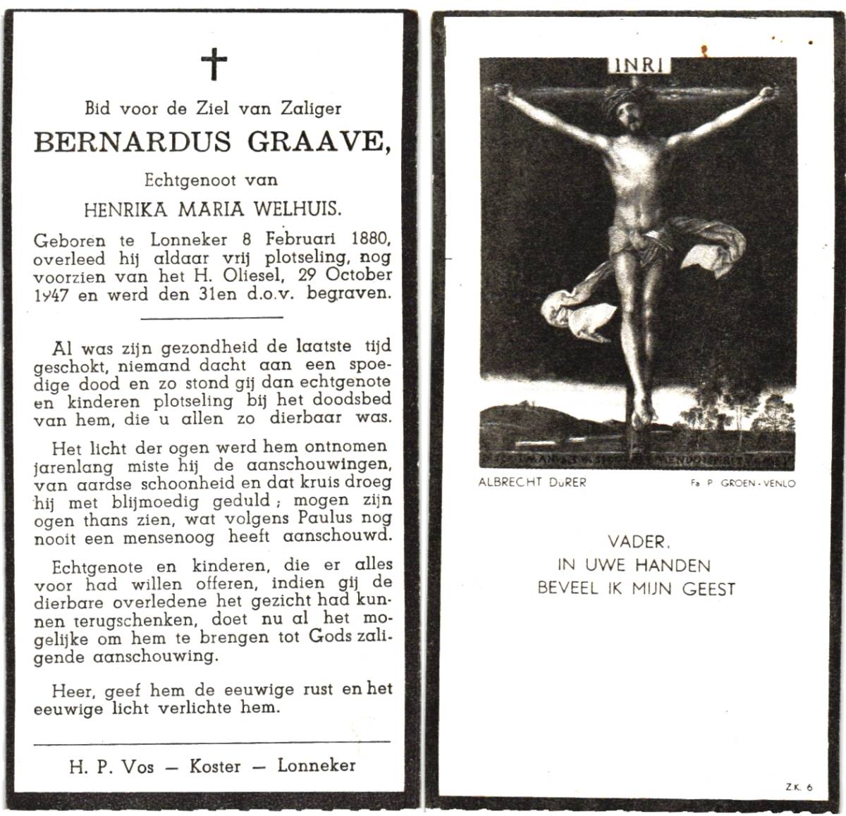 GRAAVE, Bernardus, geboren op 08-02-1880 te Lonneker, overleden op 29-10-1947 te Lonneker op 67-jarige leeftijd, begraven op 31-10-1947 te Lonneker.