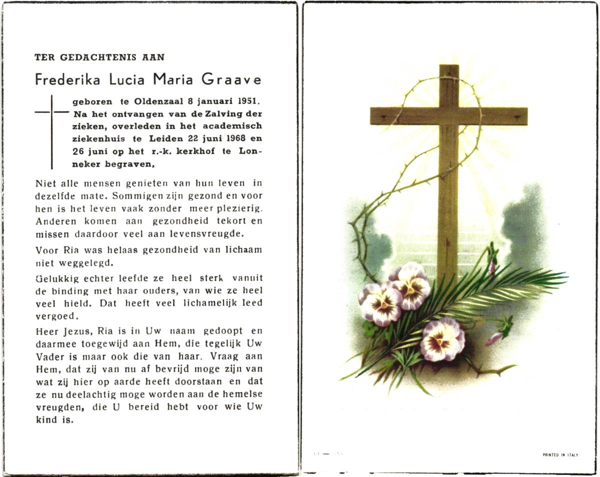 GRAAVE, Frederika Lucia Maria, geboren op 8-1-1951 te Oldenzaal, overleden op 22-6-1968 te Leiden op 17-jarige leeftijd, begraven op 26-6-1968 te Lonneker.