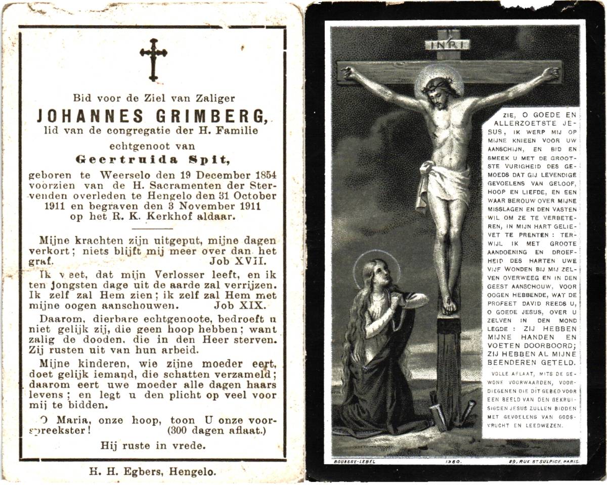 GROENHAGE , Joannes Bernardus, geboren op 12-01-1848 te Emmen, overleden op 14-1-1911 te Haaksbergen op 62-jarige leeftijd, begraven op 18-1-1911 te Haaksbergen.