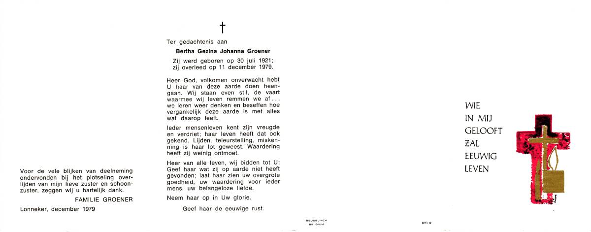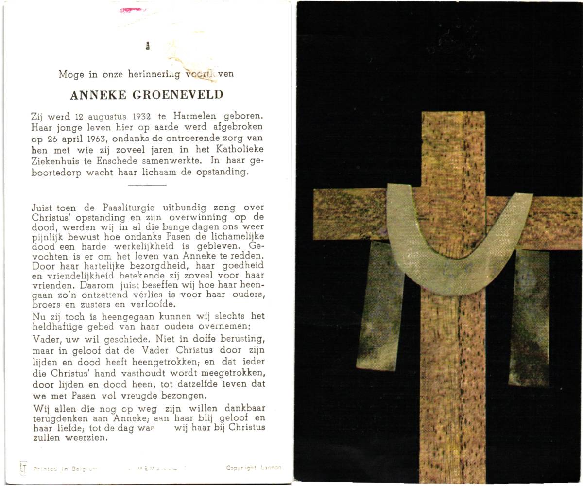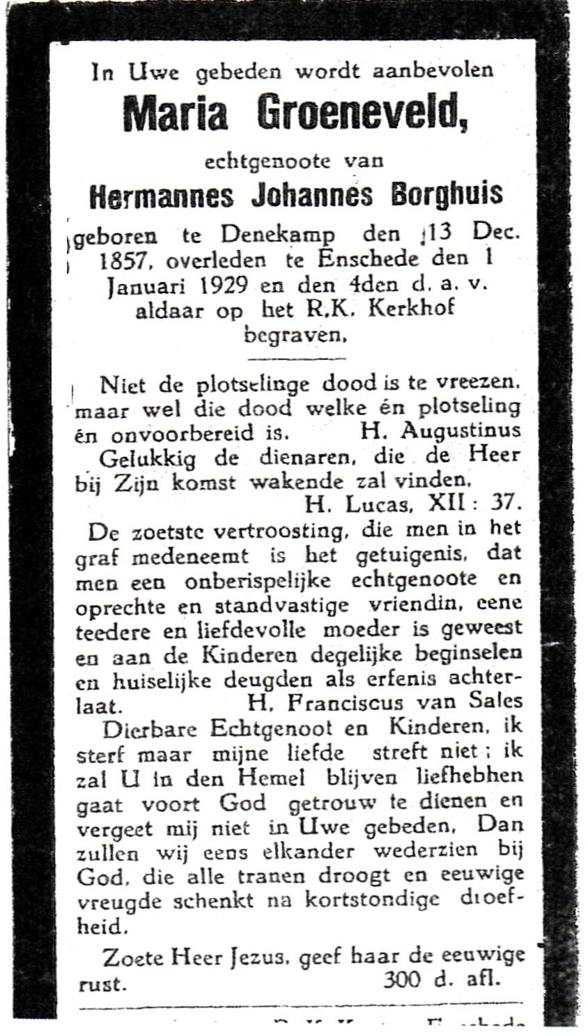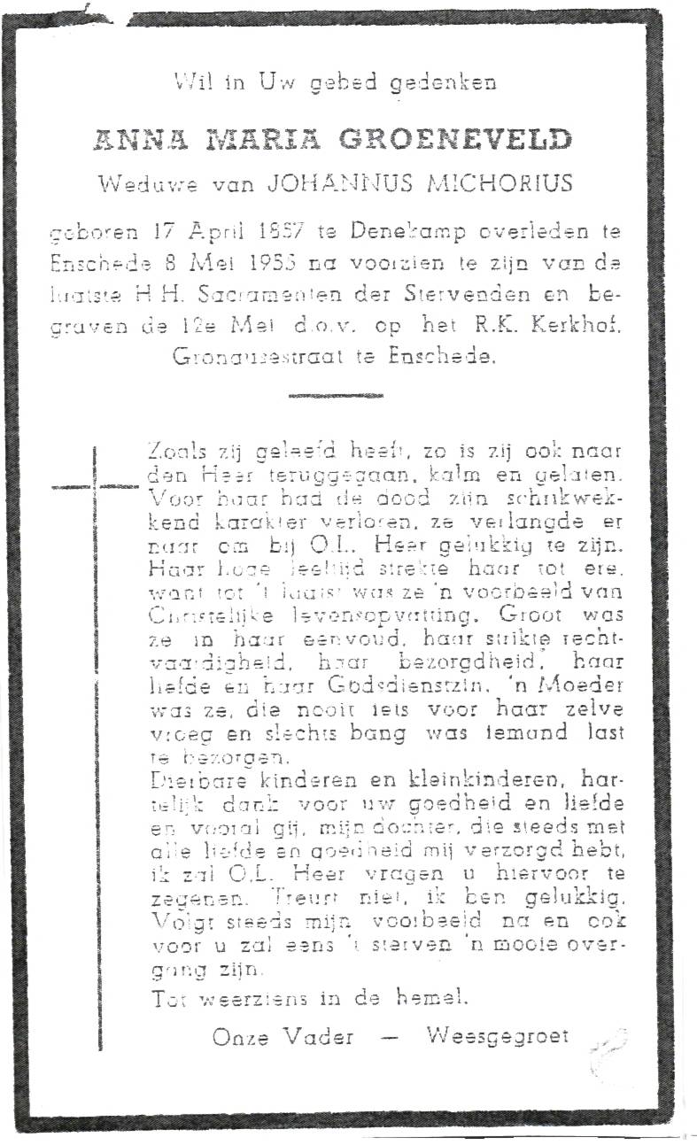 GROOTHUIS, Anna Geziena Maria, geboren op 28-7-1907 te Saasveld, overleden op 13-8-1983 te Oldenzaal op 76-jarige leeftijd, begraven op 17-8-1983 te Saasveld.
