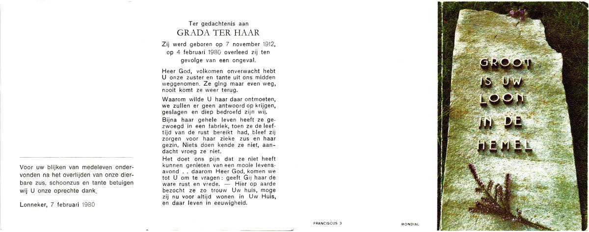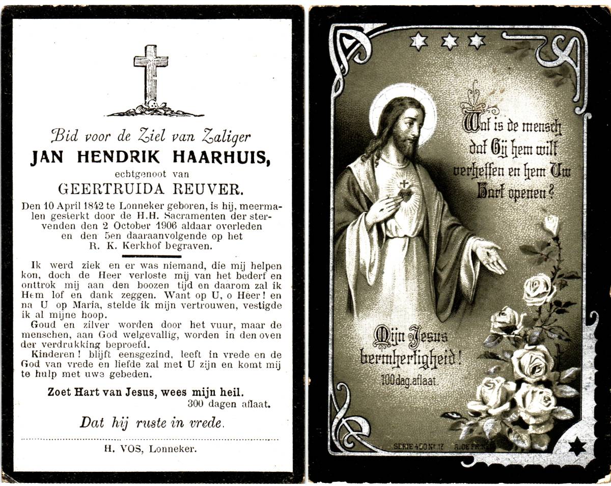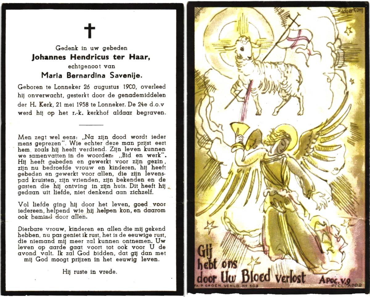 HAAR, ter, Johannes Hendricus, geboren op 26-8-1900 te Lonneker, overleden op 21-5-1958 te Lonneker op 57-jarige leeftijd, begraven op 24-5-1958 te Lonneker.