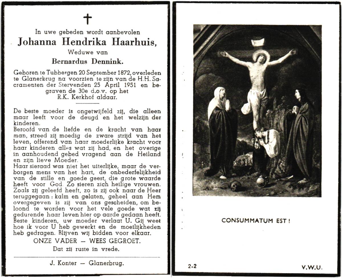 HAARHUIS, Johanna Hendrika, geboren op 20-09-1872 te Tubbergen, overleden op 25-4-1951 te Glanerbrug op 78-jarige leeftijd, begraven op 30-4-1951 te Glanerbrug.