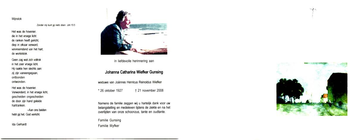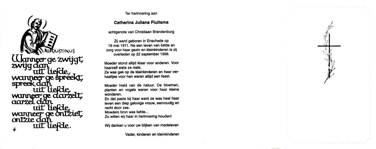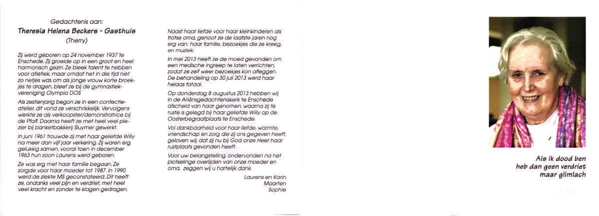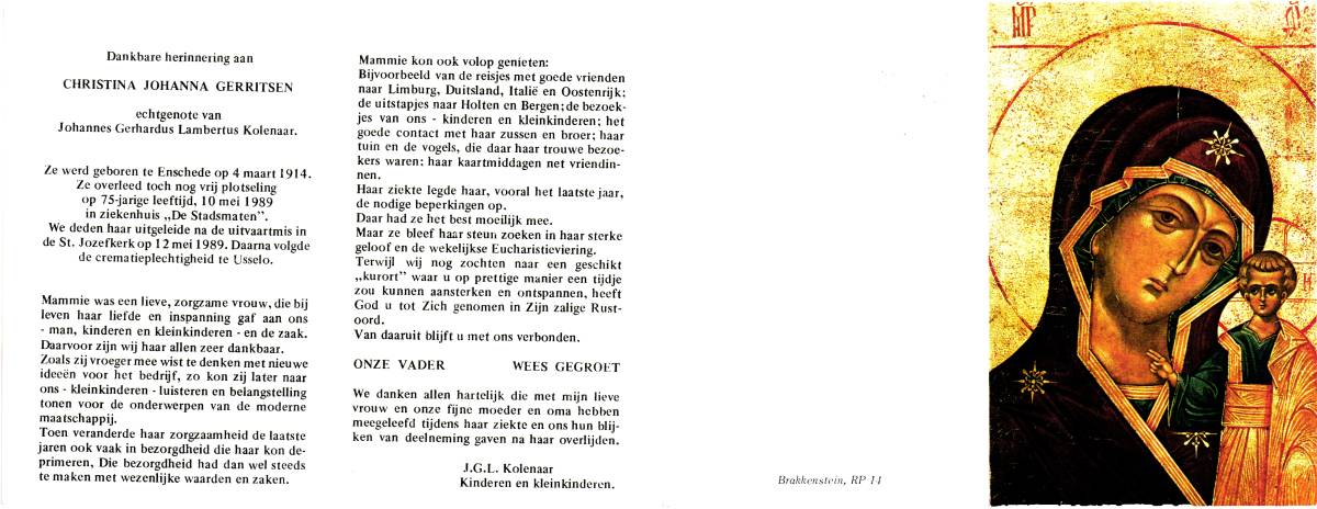 GERRITSEN, Christina Johanna, geboren op 4-3-1914 te Enschede, overleden op 10-5-1989 te Enschede, ziekenhuis op 75-jarige leeftijd, gecremeerd op 12-5-1989 te Usselo.