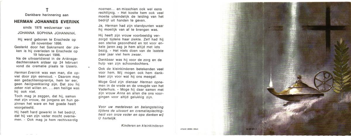 EVERINK, Herman Johannes, geboren op 28-11-1898 te Enschede, overleden op 19-2-1986 te Enschede op 87-jarige leeftijd, gecremeerd op 24-2-1986 te Usselo (Gem. Enschede).