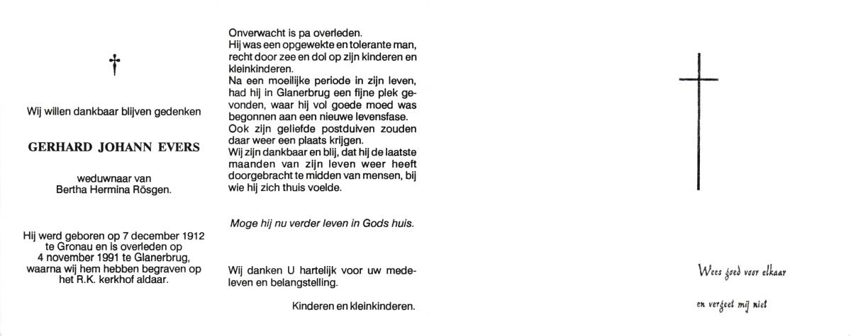 EVERS, Gerhard Johann, geboren op 7-12-1912 te Gronau, Dld, overleden op 4-11-1991 te Glanerbrug op 78-jarige leeftijd, begraven te Glanerbrug.
