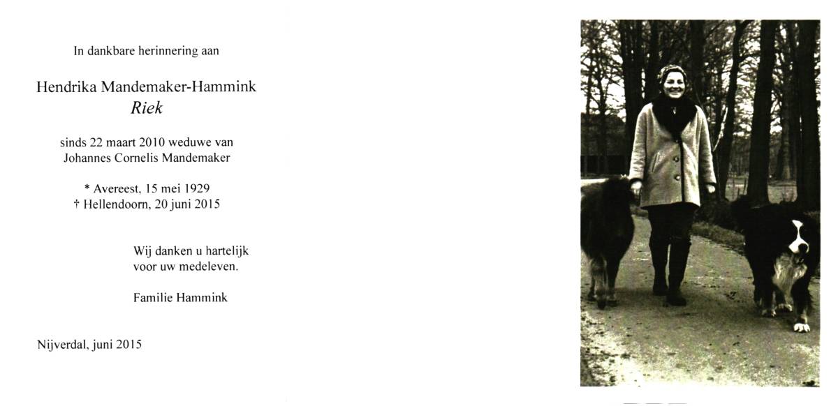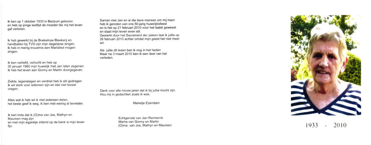 EZENDAM, Marietje, geboren op 1-10-1933 te Beckum, overleden op 26-2-2010 op 76-jarige leeftijd.