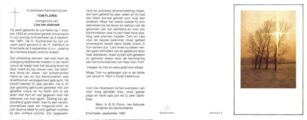 FLORIS, Tom, geboren op 7-10-1933 te Lonneker, overleden op 2-9-1991 te Enschede op 57-jarige leeftijd, gecremeerd op 5-9-1991 te Usselo (Gem. Enschede).