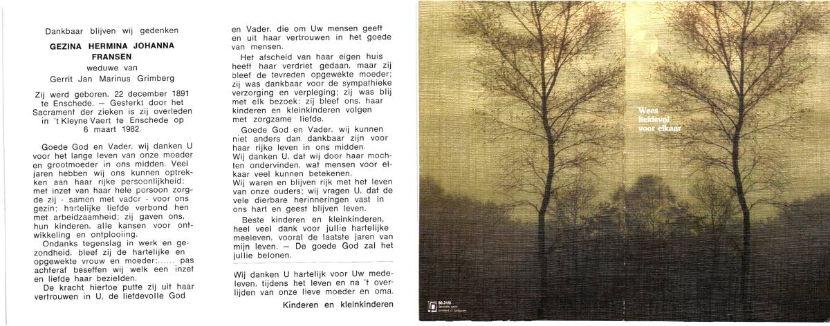 FRANSEN, Gezina Hermina Johanna, geboren op 22-12-1891 te Enschede, overleden op 6-3-1982 te Enschede op 90-jarige leeftijd.