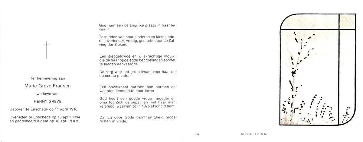FRANSEN, Marie, geboren op 11-4-1910 te Enschede, overleden op 13-4-1994 te Enschede op 84-jarige leeftijd, gecremeerd op 18-4-1994 te Usselo (Gem. Enschede).