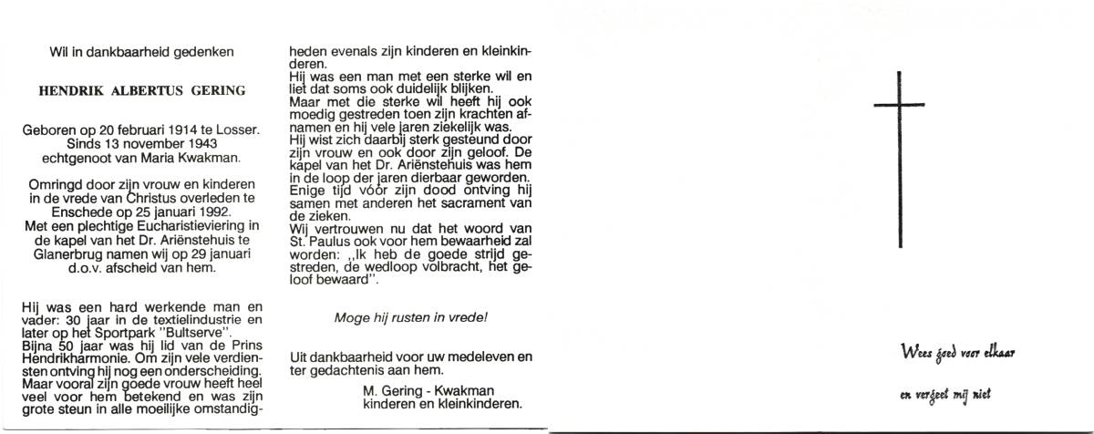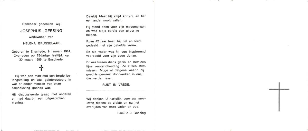 GEESING, Hendrikus Johannes, geboren op 26-5-1916 te Enschede, overleden op 15-6-1992 te Enschede, ziekenhuis op 76-jarige leeftijd, gecremeerd op 19-6-1992 te Usselo.