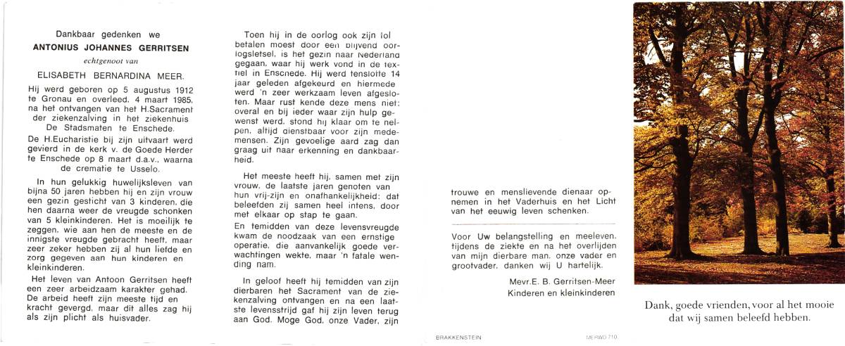 GERRITSEN, Antonius Johannes, geboren op 5-8-1912 te Gronau, Dld, overleden op 4-3-1985 te Enschede, ziekenhuis op 72-jarige leeftijd, gecremeerd op 8-3-1985 te Usselo (Gem. Enschede).