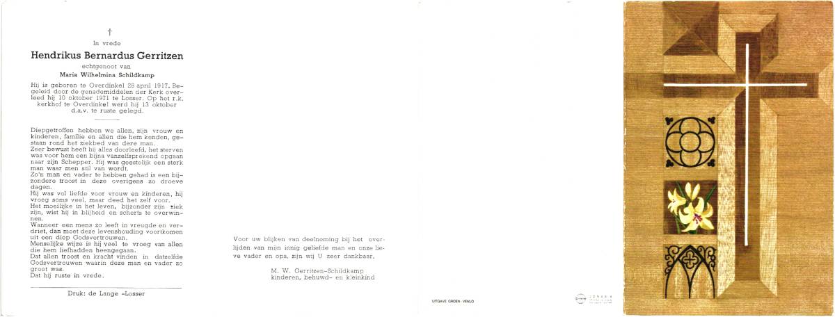 GERRITSEN, Hendrikus Bernardus, geboren op 28-4-1917 te Overdinkel, overleden op 10-10-1971 te Losser op 54-jarige leeftijd, begraven op 13-10-1971 te Overdinkel.