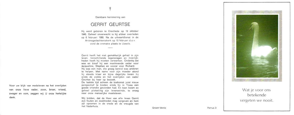 GEURTSE, Gerrit, geboren op 19-10-1945 te Enschede, overleden op 6-2-1989 te Enschede op 43-jarige leeftijd, gecremeerd op 10-2-1989 te Usselo (Gem. Enschede).