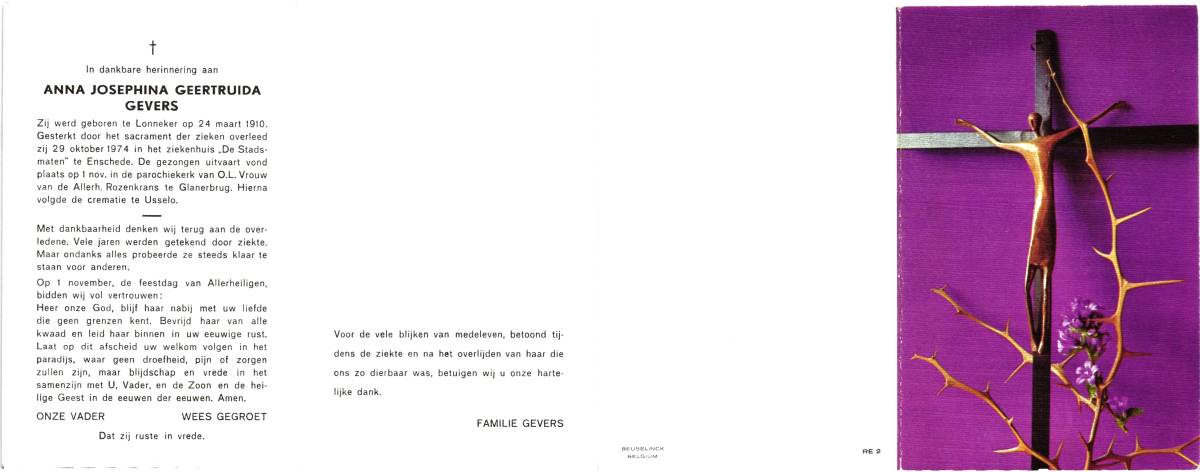 GEVERS, Anna Josephina Geertruida, geboren op 24-3-1910 te Lonneker, overleden op 29-10-1974 te Enschede, ziekenhuis op 64-jarige leeftijd, gecremeerd op 1-11-1974 te Usselo (Gem. Enschede).