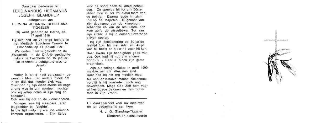 GLANDRUP, Ferdinandus Hermanus Joseph, geboren op 17-4-1916 te Borne, overleden op 11-1-1991 te Enschede, ziekenhuis op 74-jarige leeftijd, gecremeerd op 15-1-1991 te Usselo (Gem. Enschede).