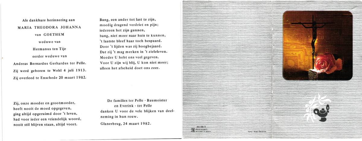 GROEN, de, Theodorus Johannes, geboren op 3-12-1927 te Enschede, overleden op 17-9-1982 te Enschede op 54-jarige leeftijd, begraven op 22-9-1982 te Groenlo.