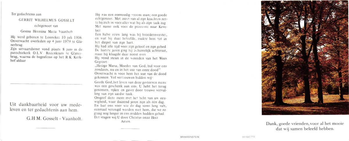 GOSSELT, Gerrit Wilhelmus, geboren op 10-7-1906 te Lonneker, overleden op 4-6-1979 te Glanerbrug op 72-jarige leeftijd, begraven op 8-6-1979 te Glanerbrug.