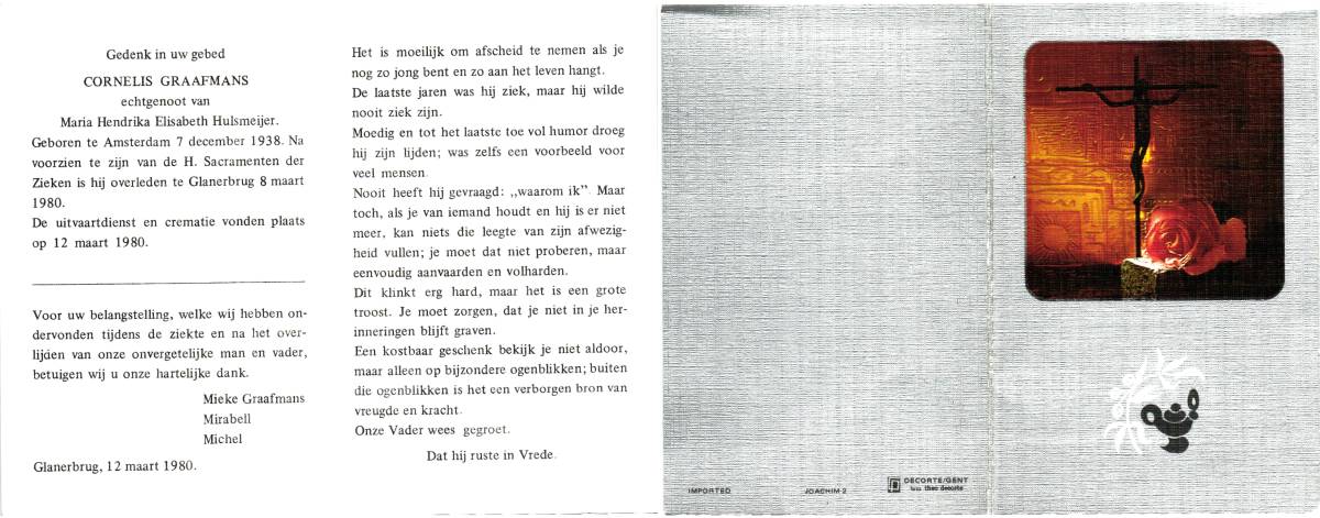GRAAFMANS, Cornelis, geboren op 7-12-1938 te Amsterdam, overleden op 8-3-1980 te Glanerbrug op 41-jarige leeftijd, gecremeerd op 12-3-1980 te Usselo (Gem. Enschede).